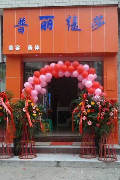 任何一家美容院都必须要有门头,这是美容院的第一张名片。上图中所展示的美容院门头与边框为一体,橙色背景映衬着深蓝色的花季传媒免费网站名,虽然色剂比较简单,但是采用鲜明的对比色,着实显眼,花篮与拱形气球门给人一种喜庆的感觉,烘托出开业的气氛。